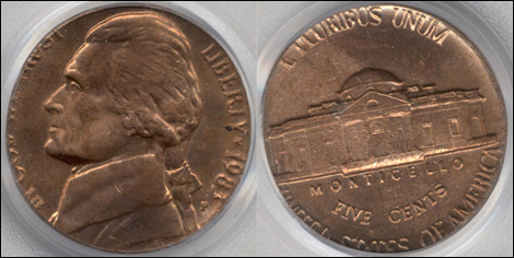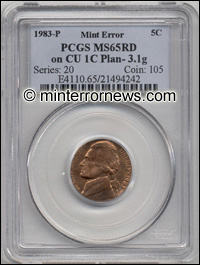 This extremely rare 1983 Jefferson Nickel TRANSITIONAL was struck on an all copper Cent planchet weighing 3.1 grams instead of the new copper plated zinc Cent planchets weighing 2.5 grams. The composition of U.S. Lincoln Cents was changed in 1982.
