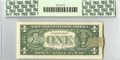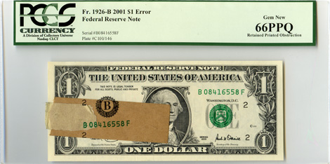 Editor’s Note: This is the second error note that I have handled where the paper and masking tape was intact (retained printed obstruction). The 3rd print (serial numbers and seals) was printed over the obstruction.