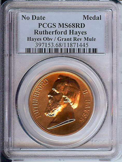 I just discovered the Hayes/Grant “MULE” medal. So far only two have been identified since it’s 2003 release as part of the ongoing Presidential Medal series from the US Mint. Ken Potter has written some articles on this in both Coin World and Numismatic News. I have the good luck of having one of the two and had it certified by PCGS as MS68RD. Since the finding of over 25 Abigail Adams mules I thought the Hayes/Grant warranted some notoriety especially with it’s extreme rarity.