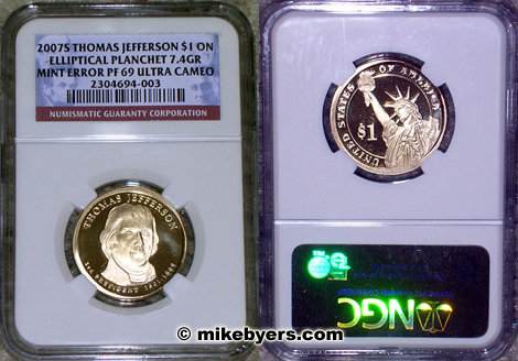 As of October 28, 2008 there are now three known proof U.S. coins struck on elliptical planchets. The first one discovered was the proof Utah Quarter which was featured on the cover of issue 23 of Mint Error News Magazine. Also discovered was a Proof Jefferson Presidential Dollar struck on an elliptical planchet. This discovery was included in issue 23. As incredible as it sounds, another proof Presidential Dollar was just discovered struck on an elliptical planchet and is featured on the cover of this issue.