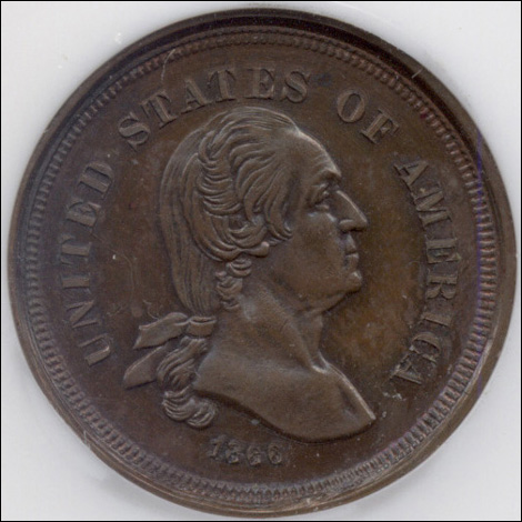 This pattern is a deliberate muling of two dies since each side has the inscription UNITED STATES OF AMERICA. The obverse die has the portrait of George Washington. The reverse is the regular die without rays, which was adopted in 1867 for the Shield Nickel.