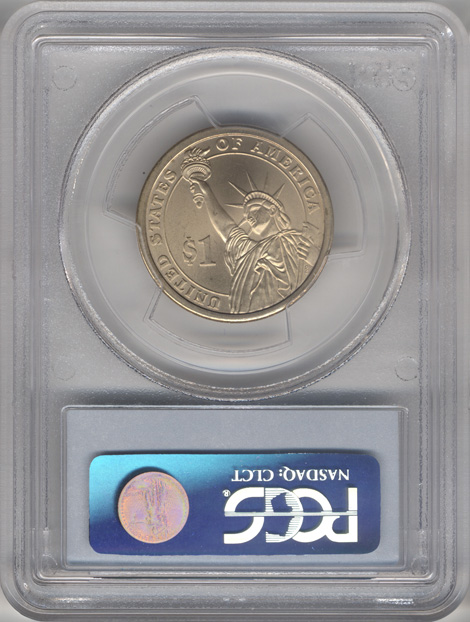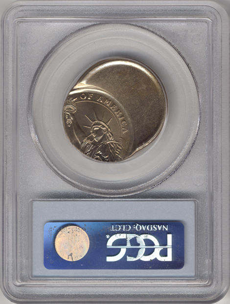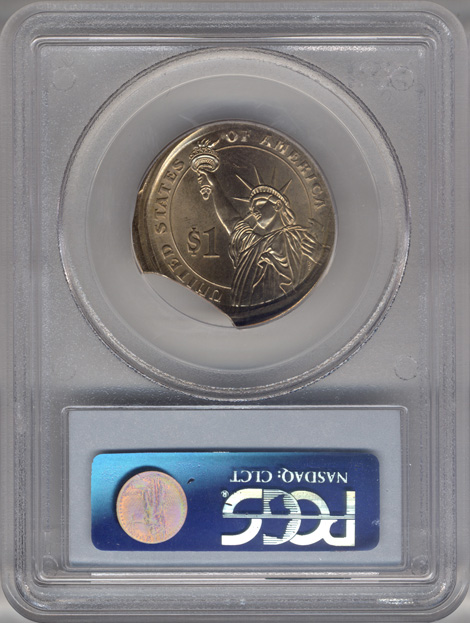 Other major mint errors in the Presidential Dollar series are very scarce. Only two or three off-centers have been reported and only a handful of double struck coins have surfaced. Several Presidential Dollars have been discovered missing either an obverse or reverse clad layer. A few of these Missing Clad Layers are also missing the Edge Lettering. To date, three Proof Presidential Dollars have been certified by NGC that were stuck on elliptical planchets. PCGS has certified a few with clips and a few that are broadstruck. Some of the major mint errors on Presidential Dollars are featured here.