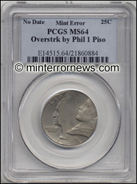 It is a large coin and there are few major mint errors known on this denomination. Somehow a struck U.S. Quarter was overstruck off-center by the Philippine 1 Piso dies. It is a spectacular and dramatic major mint error and it is extremely rare.