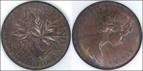 There are a few known U.S. coins struck on Canadian blank planchets, and a few known Canadian coins struck on U.S. blank planchets, but this is the only known Canadian coin of any denomination that was struck on a previously struck U.S. coin.