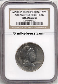 This is a Martha Washington Half Dollar. It is listed the 9th Edition of the Judd book as #2132. This piece was also certified by NGC as a half dollar-sized test piece graded MS 63.