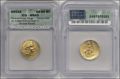 This double struck Greek Gold Stater of Mithradates VI is over 2000 years old and is in choice Mint State condition. The portrait is in very high relief and there is original Mint luster on both sides. It is double struck on both sides with a 10% rotation. A spectacular Mint Error.