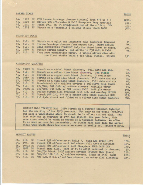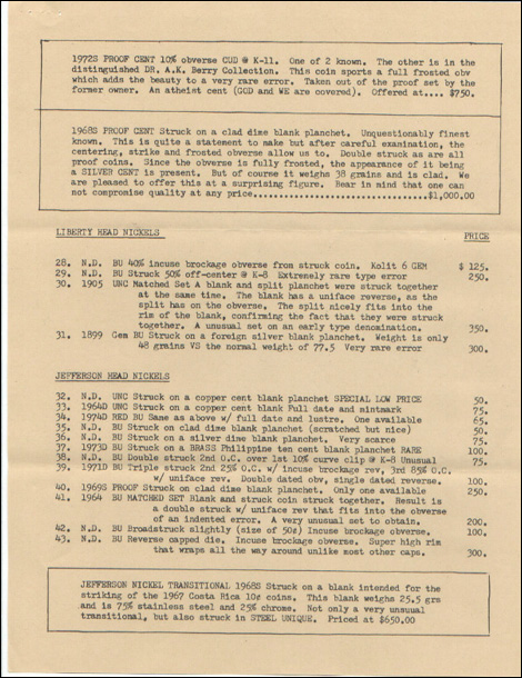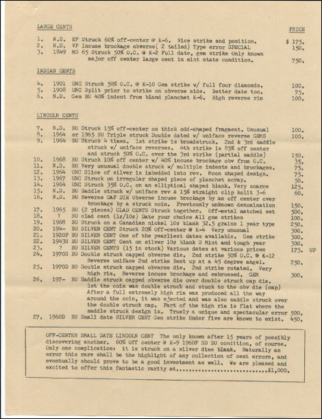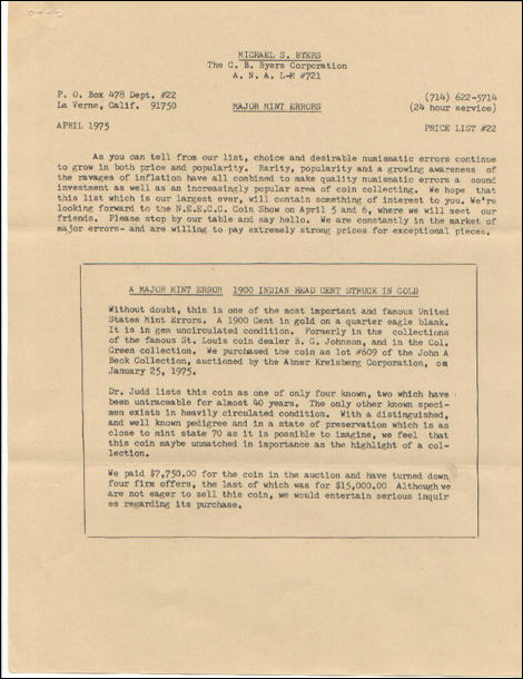 Fred Weinberg recently discovered, in an old and dusty file, one of Mike Byers' price lists on major mint errors from 3 decades ago! It is a blast for error collectors to look at. There are many major errors listed that sold for a fraction of what they bring today. One example is a 1900 Indian Head Cent struck in gold that Mike purchased from the Beck Collection in 1974 for $7,750. Today, this mint error would easily bring $75,000.