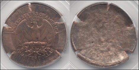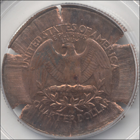 This is a spectacular major mint error and a unique discovery coin. It is the only known U.S. Quarter (pre-state or state) struck on the pure copper core.