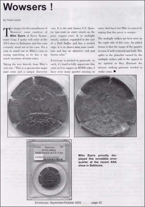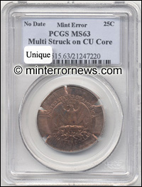 Bringing the latest mint error news to the collector. Also featuring Die Trials, Patterns, Test Pieces, Numismatic Rarities, Currency Errors and Discoveries from the U.S. Mint.