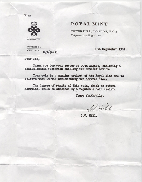 The coin featured here is a discovery coin. It is the first reported and authenticated two-headed English Victorian Shilling (Young Head). This type was struck by the Royal Mint from 1838 to 1887. It was authenticated by the Royal Mint in 1969, certified by NGC and also authenticated by several mint error experts. Since this Two Headed mint error is quite circulated it was most likely carried as a pocket piece and it is amazing that it survived all these years.