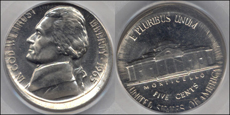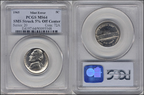 Major mint errors from Special Mint Sets are very rare. This SMS Jefferson Nickel was struck 5% off-center and is in gem condition.