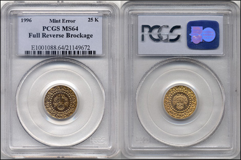 1996 Turkish Gold 25 Kurush Full Reverse Brockage