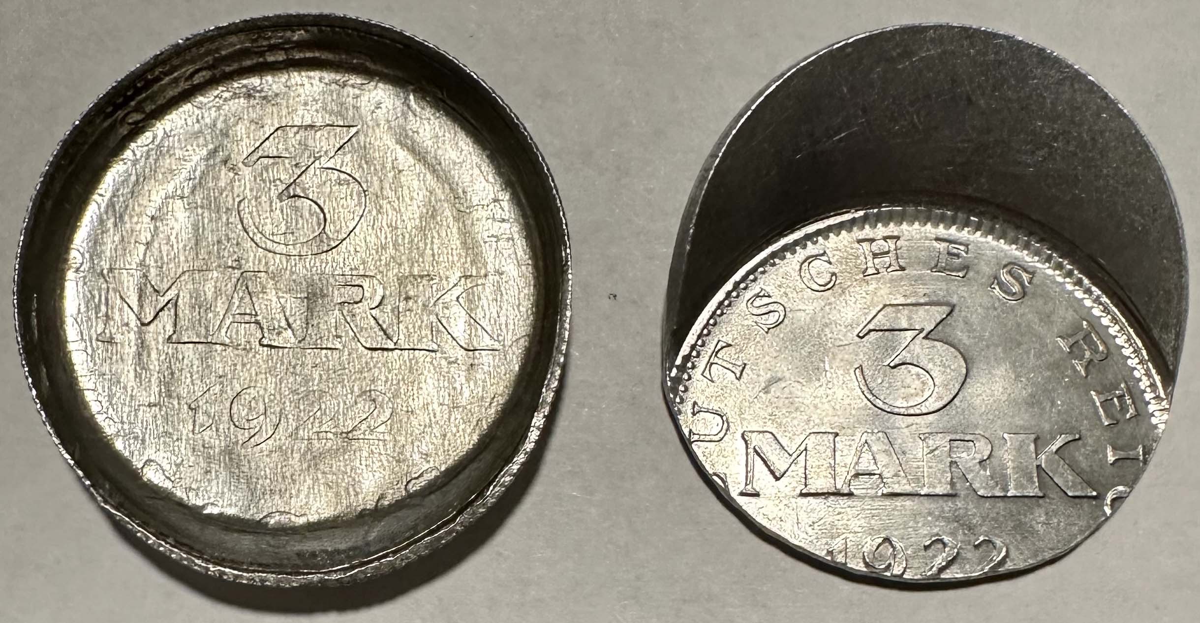 This is an extremely rare pair of German 3 Mark Mint Errors. One is a deep reverse die cap shaped like a bottle cap. The other was struck 40% off-center and is shaped like a baseball cap.