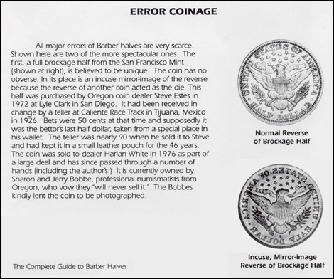 In 1976 Harlan White, another coin dealer, purchased this unique mint error as part of a large collection. It subsequently traded hands and was purchased by Fred Weinberg. At one point in time David Lawrence, author of The Complete Guide to Barber Halves, also had the pleasure of buying and selling this piece. Robert Astrich, a coin dealer from Hempstead, Texas, also handled it and wished he had kept it for himself.