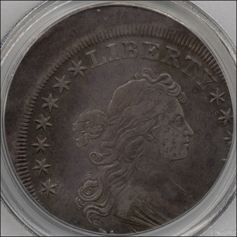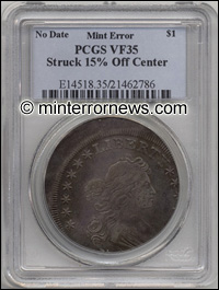 This Draped Bust Dollar mint error is well known in the numismatic community since it is the furthest off-center known. It was struck a full 15% off-center. It is attractively toned and was conservatively graded.
