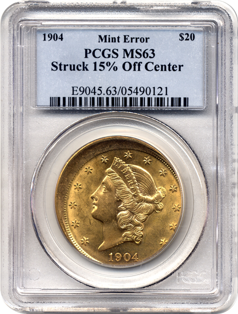 Editor’s Note: This spectacular $20 Liberty Gold Piece is the farthest off-center known. It was struck 15% off-center and certified MS 63 by PCGS. It is currently valued at $200,000 and is one of the highlights of Fred’s personal collection.