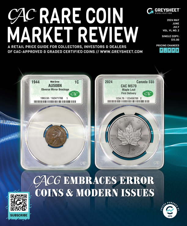 Another Lincoln Cent Wheat Reverse Mirror Brockage was featured on the cover of the Greysheet™ quarterly publication CAC® Rare Coin Market Review. It is an extremely rare 1944 Lincoln Cent with an obverse mirror brockage, designated AU 50 BN by CACG. This 1944 mint error was likely selected for the cover since Lincoln Cent Wheat Reverse errors are widely collected. Additionally, a Wheat Reverse type obverse mirror brockage dated 1944 is considered one of the important dates in the Lincoln Cent series for mint errors. This mint error combines rarity, popularity and history since it was struck during World War II.
