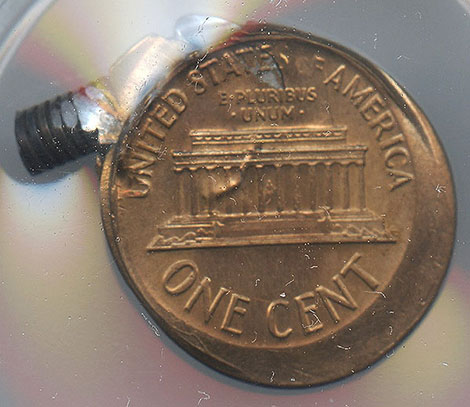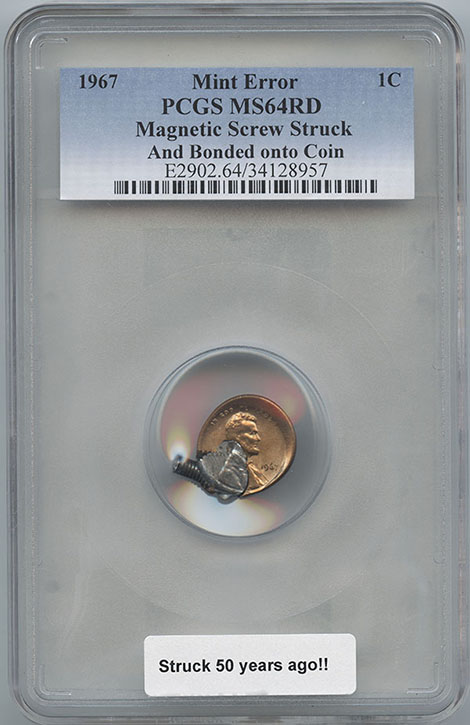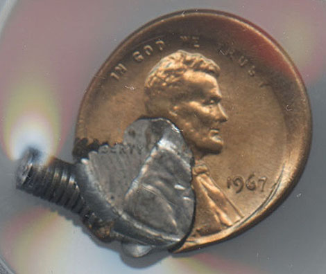 I wanted to share this incredible mint error with the readers of Mint Error News. A magnetic screw was struck and bonded onto a 1967 Lincoln Cent.