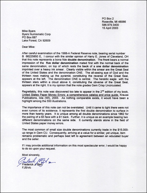 Below is an authentication letter from Frederick Bart for this unique discovery double denomination error. Frederick Bart is the author of United States Paper Money Errors: a comprehensive catalog and price guide.