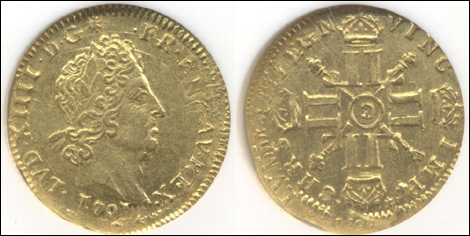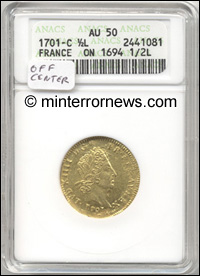 The C Mint Mark is the designation for French coins struck in Caen. Neither Krause nor any French reference books or catalogs show any ½ LD’OR struck in Caen in 1701. We contacted several well known world gold experts and none had seen or knew of any ½ LD’OR struck in Caen in 1701.