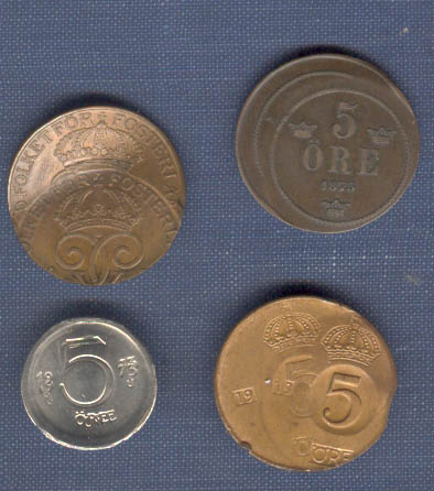 I wanted to share this group of four 5 öre coins from the last 100 years of Swedish coinage with the readers of Mint Error News Magazine. All these errors are very rare. Especially the 5 öre from Gustav V, who reigned for more than 40 years. Major errors on the 5 öre in bronze were virtually unknown until I found this coin at an eBay auction this winter. The coin was sold to me by an American dealer. The smallest 5 öre, dated 1973, was also struck on a wrong planchet, making it the first of this kind of multiple error on any Swedish coin.