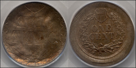 Reverse die caps in the Indian cent series are actually rarer than obverse die caps. This is a spectacular and dramatic dish shaped reverse die cap and is the size of a U.S. quarter. It is also the Cu-Ni variety from 1860 through 1864 and is in mint state condition.