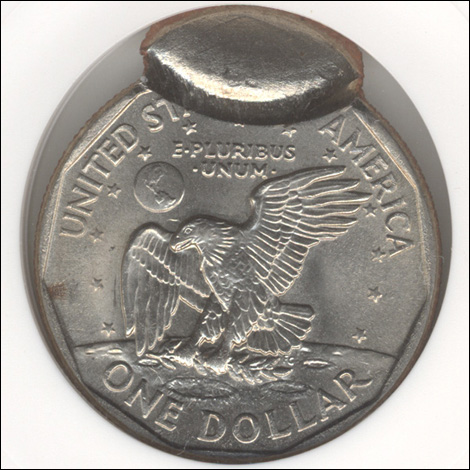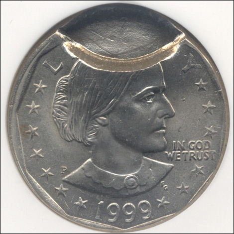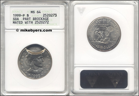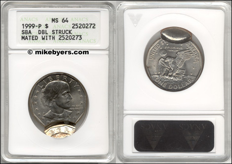 This is one of two known mated pairs of SBA Dollars. This is a double struck SBA Dollar mated to an indented SBA Dollar. It is extremely rare and a very dramatic major mint error.