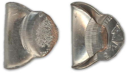 A fold-over coin is one of the most dramatic types of errors. It occurs when the blank is standing vertically between the dies. During the strike, the force is so great that it bends and folds the blank. These fold-overs can be on-center or off-center, and come in many different shapes. There are a few fold-overs with multiple errors, either with an additional strike or fold-over. Denominations above quarters are very scarce.